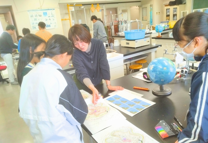 11月24日(月祝)文京キャンパスで,教育学部の三浦麻先生と山田吉英先生による「お天気が変わるのはなぜ?」を開催しました。まず,偏西風とお天気がかわる様子を知るために,回転台を使った実験をしました。水を入れた鍋の真ん中に北極の代わりに氷を入れたマグカップを置き,赤道の代わりとしてお湯を入れたたらいの中に鍋に入れました。これを回転させスマホにつけたサーモグフィーで温度が変わる様子から風や温度の動きを学びました。さらに,最近2週間の高層天気図(地上から高い位置の天気図)を色分けして天気図を並べて天気の変わるようすを調べました。